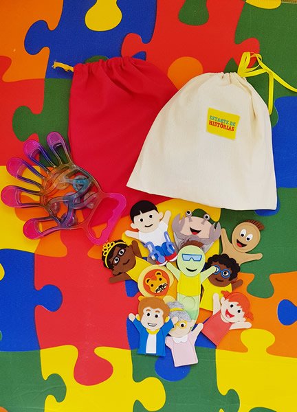 Os adereços são diferentes elementos lúdicos como dedoches, instrumento sonoro, cortina que transforma a base da estante em um lindo palco, e ainda um belo tapete de borracha para atividades de leitura ao ar livre. Tudo pensado para promover atividades nas quais as crianças possam vivenciar as histórias, criar empatia com os personagens e despertar seu lado lúdico, característica muito importante para o desenvolvimento emocional, social e da postura crítico-reflexiva, extremamente relevante para a formação cognitiva.